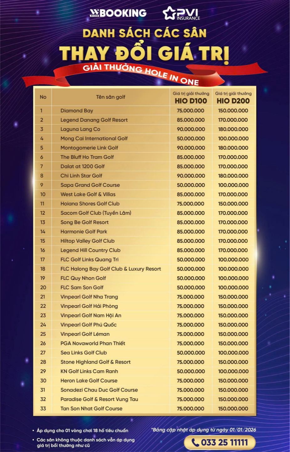Wbooking thực hiện thay đổi giá trị giải thưởng (áp dụng đối với dịch vụ giải thưởng HIO theo lượt) của 20 sân golf như sau: